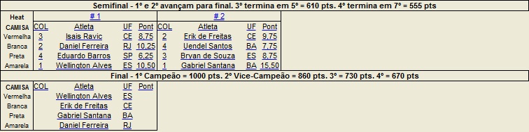 A última disputa das quartas de final será entre o local Junior Souza, que mais uma vez apresentou-se muito bem nas ondas de Jaguaribe – arrancando um 9,00 em sua bateria das oitavas – e Iraí Rodrigues, que eliminou o atual líder do ranking brasileiro: o capixaba Léo Costa.