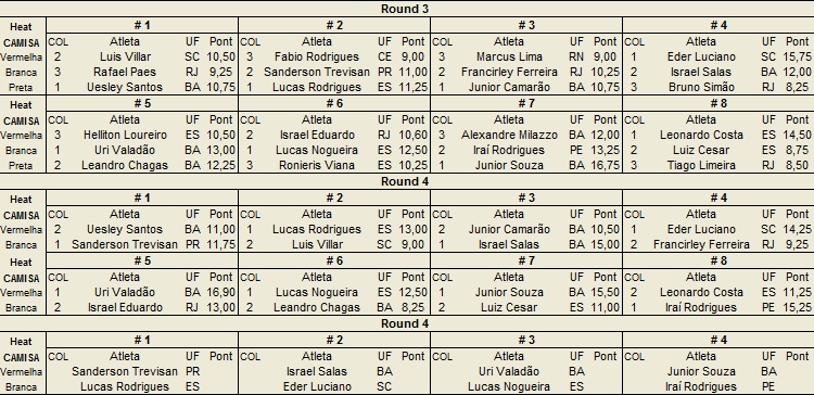 Outro que foi muito bem no terceiro dia de disputas em Salvador foi o paranaense Sanderson Trevisan. O atleta de Matinhos passou duas baterias nessa sexta-feira e confirmou sua passagem para as quartas de final. “Consegui encontrar boas ondas nesse mar, que está bastante complicado. Procurei ser consistente o maior tempo possível e achei boas ondas para passar de fase”, analisou Sanderson. Nas quartas Sanderson encara o capixaba Lucas Rodrigues.